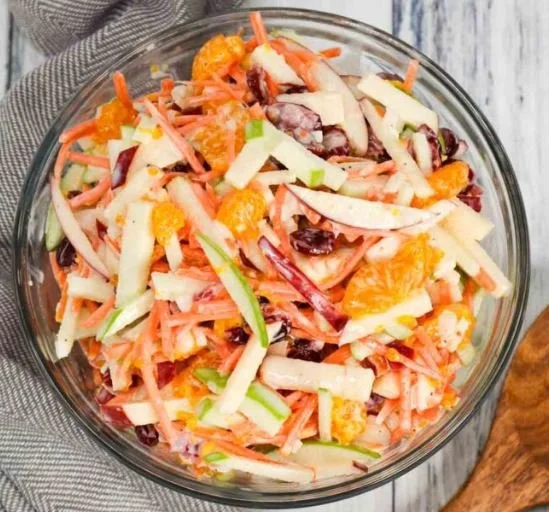 Combine carrots, apples, and raisins in a large mixing bowl.