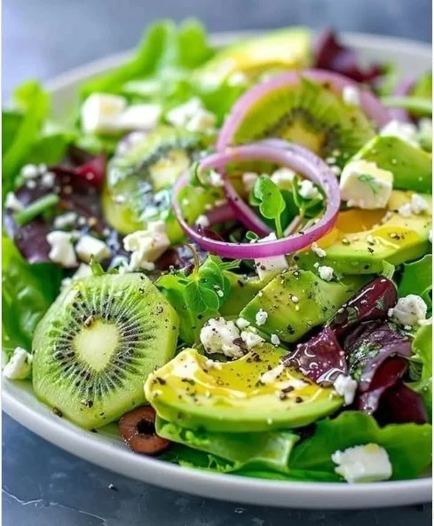 •. Assemble the Salad: In a large bowl, combine mixed greens, diced avocados, sliced kiwis, and red onion.